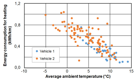 Dependence of the specific heating demand of a 12 m bus on the ambient temperature [2].