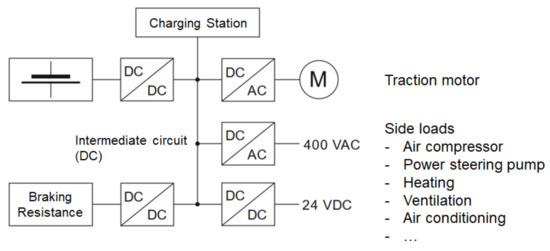 Regarding the electric architecture, a DC intermediate circle is typically used in combination with DC/DC converters and DC/AC converters for the electric consumers. The typical voltages are 650 to 750 VDC for the battery relative to the intermediate circle. The typical voltages of electric consumers, such as an air conditioner or air compressor, are 400 VAC. Additionally, there is a 24 VDC voltage level for electric consumers that have a lower electric power demand. Components with high power consumption, such as a fully electric resistance heater (see also Section 2.3.2), are typically operated with high voltages, either on the high voltage DC level or with the 400 VAC level. An example of a battery-powered bus electric architecture is shown in Figure 2 [2,11].