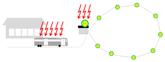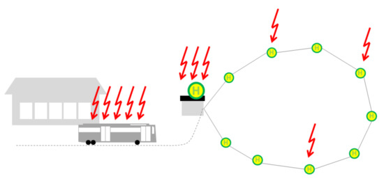 Another variation of the opportunity charging scenario is the opportunity charging scenario taking place at multiple stops, as illustrated in Figure 6. Besides the installation of the charging infrastructure at the bus terminal and the final stops, the charging infrastructure at regular bus stops is installed. Since the stop times at regular stops are pretty short (typically within the range of 20 to 90 s, according to Cundill and Watts [20]), high charging powers are required to be able to recharge significant amounts of energy. Regarding the charging infrastructure, an even higher amount of effort is necessary since more locations have to be equipped; however, the storage capacities of the buses can be lowered. For this charging scenario, ultra-high-power batteries are required (see Section 2.1.3) [2].