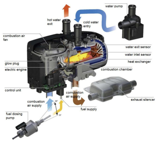 - Eberspächer. Eberspächer Wasserheizung Hydronic. 2019. Available online: https://www.eberspaecher.com/produkte/fuel-operated-heaters/produktportfolio/wasserheizungen.html (accessed on 6 March 2019).