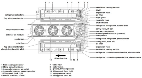 To give an idea of how the aforementioned components are implemented into an electric-powered city bus, the architecture of the thermal management is described within this section. As an example, the thermal management architecture of the EvoBus eCitaro is shown in Figure 13.