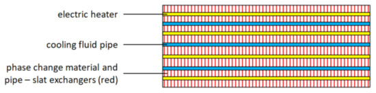 The storage is designed to be in a rectangular shape. For charging, electric resistance heaters (720 VDC) are used, while for discharging, pipe–slat heat exchangers are brought directly into the storage material. Regarding the discharging medium, the cooling fluid of the vehicle is used. The conceptual design of the storage setup is shown in Figure 11, while an outer view of the installed storage is shown in Figure 11.