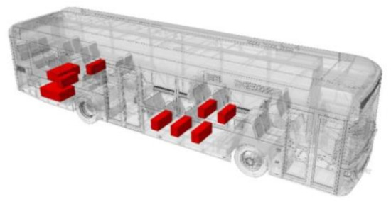 Intended positions of the thermal energy storage modules (red) within the interior of a bus [40].