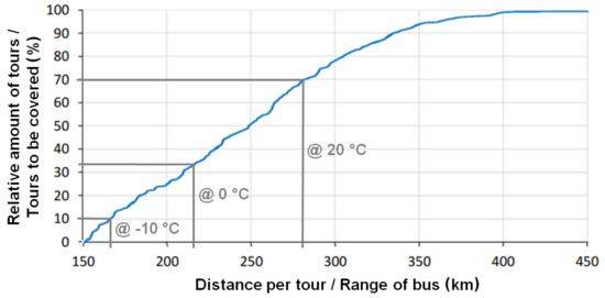 The second challenge to be discussed is the insufficient range of battery-powered electric buses in non-ideal ambient conditions, especially in winter conditions when interior heating is required. A further explanation of this issue is given in Figure 14. On the x-axis of Figure 14, the distance of a city bus’s daily tour relative to the range of a battery-powered electric city bus is given. On the y-axis, the number of tours relative to the tours that can be covered is given. Therefore, the blue line represents the relative number of tours covering the given distance as a function of the relative number of tours that can be covered with a city bus offering the range given on the x-axis. To show the number of tours that electric city buses can cover, grey bars are given using the EvoBus eCitaro as an example. As before mentioned, this bus is offering a range of 280 km under ideal ambient conditions, which is stated to be 20 °C. Referring to the diagram, a range of 280 km is sufficient to cover 70% of all tours within the German bus transport system. However, when interior heating is required, the range of the bus decreases if heaters consuming electric energy are used, and therefore the number of tours that could be covered with the bus decreases as well. Using an ambient temperature of about −10 °C as an example, interior heating of about 1.4 kWh/km is required, according to Figure 1. Since the eCitaro is offering an electric CO2 heat pump, the electric energy consumption is reduced. According to the manufacturer, a COP of about 2 can be reached at an ambient temperature of −10 °C, leading to energy consumption of about 0.7 kWh/km for heating [33]. Together with an energy consumption of 1.04 kWh/km for traction (calculated based on the battery capacity and maximum range), the overall energy consumption would be approx. 1.74 kWh/km, leading to a maximum range of approx. 167 km. As can be seen in the diagram, a range of 167 km would be sufficient for only about 10% of all tours.