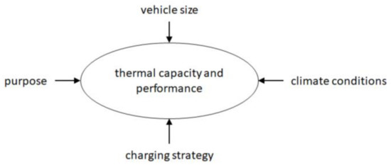 Thermal capacity and performance are described together within one section since both are influenced by the same parameters, where performance refers to the charging (electric power) and discharging (thermal output) performances. Both are influenced by the purpose, vehicle size, climate conditions, and charging strategy. Figure 15 visualizes the influence of these parameters.