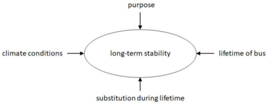 Regarding the cost, it is important what viewpoint is taken to determine the requirements. Possible viewpoints could be the one of a manufacturer of the heating system, a manufacturer of a bus, or the user of a bus, which is normally the transport operator. For a manufacturer, it would, e.g., be important to produce THS as cheap as possible to be able to offer attractive prices and keep the margin as high as possible. In the authors’ view, the cost borne by the end user is regarded to be relevant, since the end user is the one that decides what kind of heating system they would like to have. In terms of buses, the end user would be the transport operator. For a transport operator, the total cost of ownership is relevant. The main influences on this are the cost for purchase and therefore the manufacturing cost, the energy cost while in operation, the maintenance cost, and the decomissioning cost. The influence of these four parameters is expressed in Figure 17.