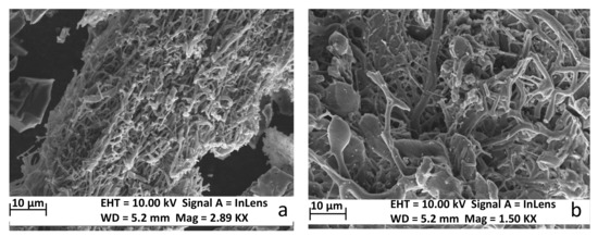The microstructural investigation was achieved with a Sigma VP FEG Carl Zeiss SEM, (Zeiss, Oberkochen, Germany). The samples were arranged on a carbonic strip and then analyzed in liquid nitrogen atmosphere.