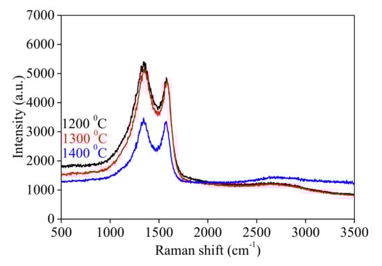 - A relaxation of the molecular orbitals at high temperatures is noticed, the G band from Raman measurements being shifted to a lower value (i.e., 1568 cm−1 at 1400 °C compared to 1576 cm−1 at 1200 °C).
