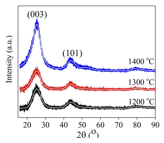 In Figure 3, the diffractograms corresponding to the samples calcined at 1200 °C, 1300 °C, and 1400 °C respectively, are represented on the same graph for a better visualization of the results, after removing the background component. The three diffractograms are fitted on the same hexagonal graphite crystal structure (ICDD 01-073-5918), with group crystalline symmetry R-3m. The three spectra indicate that the samples are single-phase, consistent with the crystalline structure of the graphite, with the difference that the positions, intensities, and widths of the peaks are slightly different, denoting that the degree of amorphization of the crystalline structure depends on the temperature used in carbonization process. For the sample prepared at 1200 °C, the crystal lattice constants obtained from the fit to the corresponding data are a = b = 0.2439 nm and c = 1.0596 nm. At 1300 °C, the corresponding values are a = b = 0.2431 nm and c = 1.0492 nm, respectively. Compared with the values of the lattice constants determined for the sample prepared at 1400 °C (i.e., with a = b = 0.2446 nm and c = 1.0566 nm), these values are similar in the limit Δa/a ~0.28% and respectively Δc/c ~0.99%, denoting a small impact attributed to the preparation temperature, with respect to crystalline structure. However, the intensity of the main Bragg reflection (003) is much more prominent for the diffractogram of the sample prepared at 1400 °C, indicating a higher degree of crystallinity, compared to the samples prepared at lower temperatures.