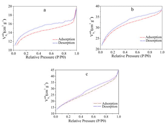 The porosity and the structure of the prepared samples were studied considering N2 physisorption isotherms and applying the Brunauer–Emmett–Teller (BET) method. The corresponding isotherms for the three samples are provided in the Figure 4. The isotherms show characteristics of type IV with a uniform H4 hysteresis loop at a relative pressure domain of 0.4–0.95, with steep adsorption/desorption branches, highlighting a good transport property between the microporous and mesoporous channels. The hysteresis loop is a consequence of various mechanisms that occur in pores between capillary condensation and evaporation processes.