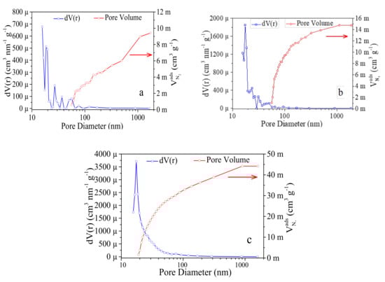 Pore size distribution of: (a) 1200 °C (C-5); (b) 1300 °C (C-10); (c) 1400 °C (C-15) samples.