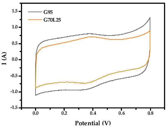 Cyclic voltammetry at 5 mV/s of G95 electrode and G70L25 electrode in 1 M H2SO4.