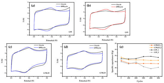 Cyclic voltammetry at 20 mV/s (a) specific capacitance decreased after 4990 cycles for the electrode of G95 in 1M H2SO4; (b) specific capacitance increased after 4990 cycles for the electrode of G95 in 1 M H2SO4; (c,d) specific capacitance decreased after 4990 cycles for the electrodes of G70L25 in 1 M H2SO4; (e) the plot of specific capacitance verse cycle at 20 mV/s in H2SO4.
