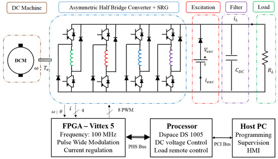 Figure 4 displays the experimental testbed. It includes a DC Machine emulating the primary energy source. The SRG with a 8/6 four-phase topology whose characteristics are given in Table 1 feeds the 24V DC bus. An Asymmetric Half-Bridge Converter (AHBC) is used to control the SRG operation. The AHBC is energized from the external excitation source during magnetization mode and provides power to the load (an equivalent resistance) through the DC bus during generation mode. Both the excitation source and load are connected to the same 24V DC bus. For higher tolerance, the DC bus can be split into one for excitation mode and another for generation mode. An incremental encoder is mounted on the rotor for rotor position and speed measurements. The control part includes a host PC for programming, supervision (Matlab-Simulink, Control-Desk), and data acquisition. The digital controller is composed of a Digital Signal Processor (DS1005) for DC voltage control loop and FPGA chip for current control.