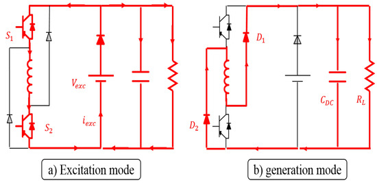 After excitation mode, switches and are turned off and current flows towards the load (represented here by an equivalent resistance ) through diodes and , as it can be seen in Figure 3b. The magnetic energy that is stored during the excitation mode is transformed into electrical energy and transferred to the load. In this step, the current decreases due to the negative back-emf (see Equation (2)). During this period, Equation (2) can be rewritten as Equation (7). To control the generated current, condition must be fulfilled. Otherwise, the generated current always increases and becomes uncontrollable.