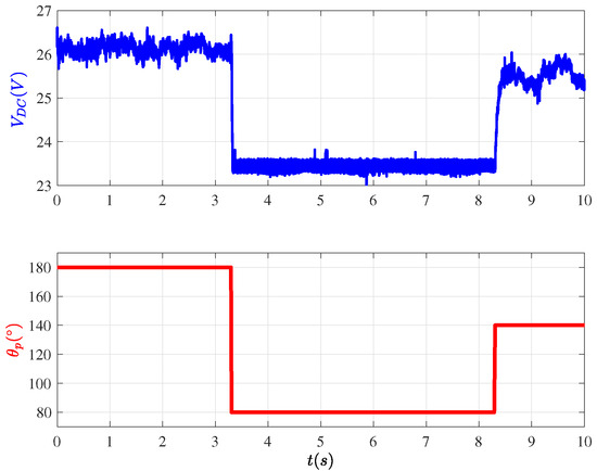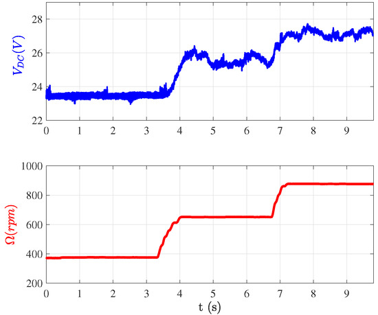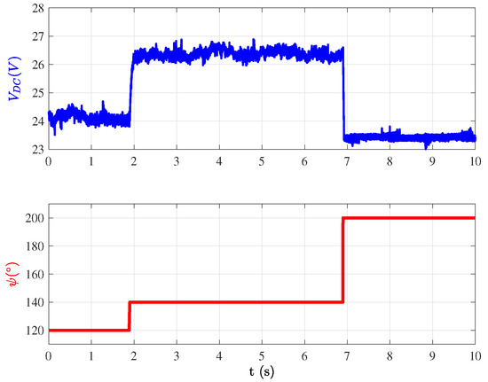 The generated DC voltage depends on several parameters, such as the turn on angle , the conduction angle , the phase current reference , the speed , and the load [9]. Preliminary experimental open-loop tests have been carried out to analyze the influence of these parameters on the DC bus voltage. Figure 5 shows the influence of the turn on angle when the other parameters are constant. When the turn on angle varies from to , the voltage varies from 24 V to V, respectively. Figure 6 illustrates the behavior of the DC bus voltage under the conduction angle variation when the turn on angle is set at the unaligned position of the inductance () at 800 rpm. With different values of the conduction angle at: , and , the DC bus voltage changes to different values: V, V and 26 V, respectively. To conclude, the SRG generated voltage increases when the conduction angle increases. From Figure 7, we can also see that phase current reference also has an important impact on the DC bus voltage. Figure 8 shows the DC bus response to a speed step change. As expected, the DC voltage increases with speed. Figure 9 shows the dynamic response of the DC voltage to step changes of the load. The DC voltage increases when load current decreases (the resistance is increased).