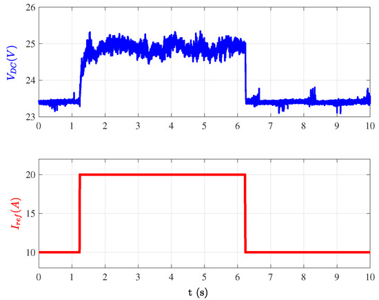 Influence of the reference current on the DC bus voltage. The other parameters are set to: , , , and rpm.