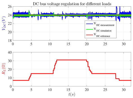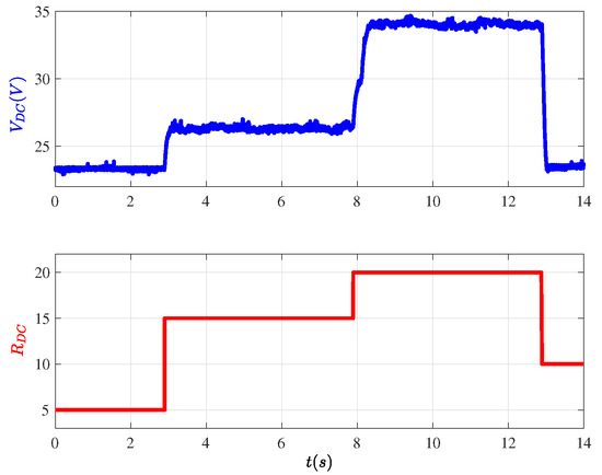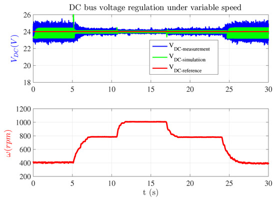 To evaluate the speed variation effect on DC bus control, simulations are conducted with the following conditions: DC bus voltage is regulated at V and load resistance is set at first to a constant value . Figure 14 illustrates DC voltage waveforms under variable speed for 30 s. We can notice good DC voltage regulation performances in both simulation and test cases. This transient test shows the effectiveness of the proposed control strategy under fluctuated wind speed.