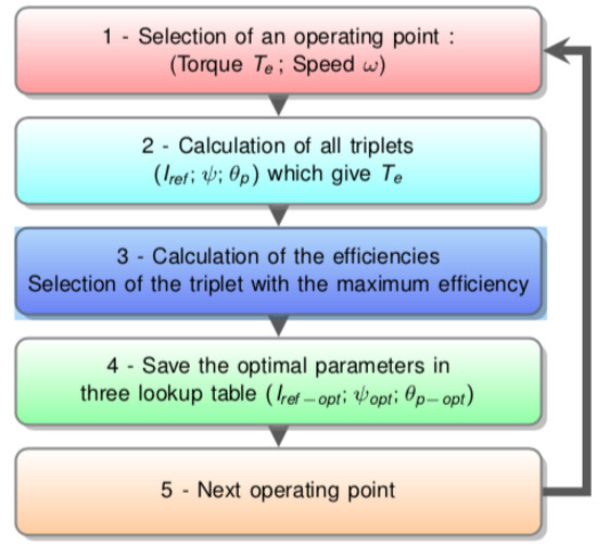 The parametric optimization method is presented in the following flowchart (Figure 10). For a given speed , the desired torque can be obtained with different triplets . The triplet, which is selected and stored in lookup tables, is the one that satisfies the objective of maximal efficiency and respects the constraints of minimal torque ripples. This procedure is repeated for all of the operating points in the torque-speed plane. Pulse width modulation is no longer possible beyond base speed (1300 rpm). Therefore, the current reference is set as constant, and only the excitation angles (turn-on and conduction angles) are optimized.