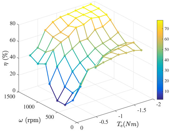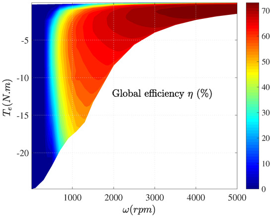 Figure 11 displays the efficiency of the drive in the torque-speed plane: the results show that the highest efficiency of the drive is almost 70%.