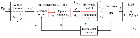 These approaches can, of course, be combined, depending on the application and the targets. In our study, the electrical machine is legacy equipment and the power converter has been designed as a classical asymmetric half bridge that is commonly associated with Switched Reluctance Machine. Accordingly, the challenge is to improve the efficiency while using only control parameters. As previously mentioned, the main issue for Switched Reluctance Machines control is to mitigate torque ripples (voltage ripples) and operate the drive at its higher efficiency [29] for all of the operating points in the torque-speed plane. The control variables or degrees of freedom that have been identified are the phase current reference, the commutation angles, and the excitation voltage. In [30,31], the authors have addressed the issue of torque ripples reduction through the appropriate design of controllers.