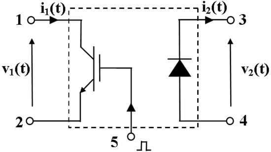 The considered switch contains 5 terminals: 3 terminals of IGBT and 2 terminals of the diode. During operation of such a switch in any DC–DC converter, a control signal in the form of a rectangular pulses train is connected to terminal number 5. The transistor and the diode are connected to other components of the considered DC–DC converter as shown in its diagram. Voltage between pairs of terminals 1, 2 (v1(t) voltage) and 3, 4 (v2(t) voltage) have the shape of rectangular pulses trains. At the steady state waveforms of voltages and currents are periodical.