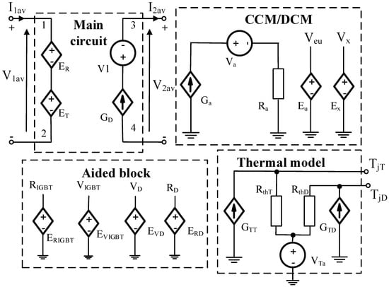 The main circuit includes two controlled voltage sources ER and ET modeling average voltage between output terminals of IGBT and controlled current source GD modeling the average value of diode current. Voltage source V1 of zero value is used to monitor the average value of diode current. Values of currents I1av and I2av, as well as voltages V1av and V2av in the main circuit, are average values of diode and transistor voltages and currents. The connected in series controlled voltage sources ER and ET model a voltage drop between transistor output terminals. Controlled current source GD models diode current. The output values of these sources are described with elaborated formulas using the concept presented in the papers [,]. According to this concept, in each period of the control signal, current flows through the transistor for a time equal to d·T, and through the diode—for a time equal to (1-d)·T, wherein T is period of the control signal. Diode current–voltage characteristic and transistor output characteristic are described by piecewise linear functions. Parameters describing such piecewise linear functions depend on internal temperatures of the diode and IGBT. Values of these parameters are computed in the aided block, whereas internal temperatures of semiconductor devices are computed in the thermal model. The equivalent duty cycle Veu, adequate for operation of the DC–DC converter containing the modeled diode–transistor switch, is computed in CCM/DCM block shown in Figure 2. The value of Veu depends on duty cycle and frequency of the control signal, inductance of the inductor contained in the analyzed DC–DC converter and output current of this converter.