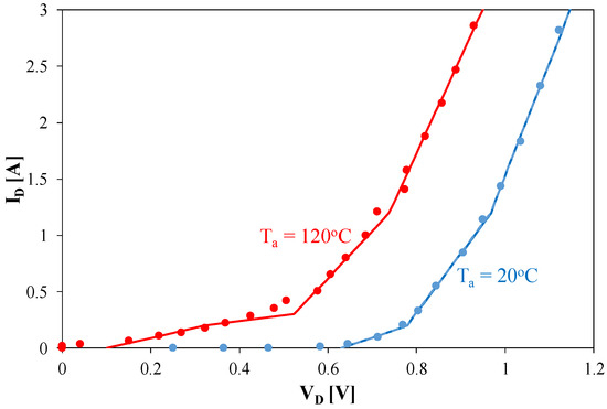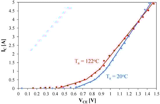 Output characteristics of insulated gate bipolar transistor (IGBT) computed with the use of a piecewise linear model (lines) and measured (points) at selected values of temperature Ta.