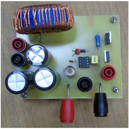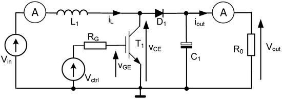 In the considered converter, the input voltage Vin was equal to 12 V, and R0 was load resistance. The inductance of inductor L1 was equal to 560 µH and capacitance of capacitor C1 was equal to 1 mF. Voltage source Vctrl produced a rectangular pulsed train of frequency f equal to 10 kHz and duty cycle d. Ammeters were used to measure the input and output currents of the tested converter. Internal resistance of these ammeters was equal to 0.31 Ω. The prototype was mounted on a PCB; the diode of the type IDP08E65 and IGBT of the type IGP06N60T operated without any heat-sinks. The control signal was given by a signal generator exciting gate driver IR2125 by Infineon Technologies.