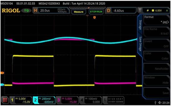 Some waveforms of voltages and currents of the tested DC–DC converter were measured using an oscilloscope Rigol MS05104 and current probe Tektronix PCPA 300 for different parameters of the control signal and load resistances. For example, in Figure 7 measured waveforms of vGE(t) voltage (yellow line), vCE(t) voltage (violet line) and iL(t) current (blue line) are shown. The mentioned quantities are marked in Figure 5. Waveform of iL(t) was obtained after conversion of the measured current into voltage in the current probe. The conversion coefficient was equal to 1 A/V. During these measurements load resistance R0 was equal to 47 Ω.