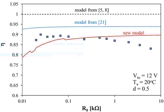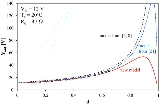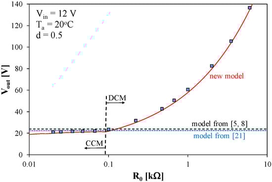 In Figure 8 measured and computed dependences of converter output voltage Vout on load resistance R0 are presented. As is visible, in the considered operating conditions, the boost converter operated in CCM for R0 < 100 Ω and in DCM for R0 > 100 Ω. In both modes of operation, the new model guarantees good accuracy of computations. At small values of load resistance, a decrease was visible in the value of output voltage caused by influence of a voltage drop on the switched on transistor and diode. This voltage drop was an increasing function of converter output current and a decreasing function of load resistance R0. Literature models described in [,,] could be used for the converter operating in CCM only, because differences between the results of computations performed with these models and the results of measurements were acceptable only in this mode. Of course, the results performed with the use of the model proposed in [] were more convergent with the results of measurements in CCM than the results performed with the model given in [,].