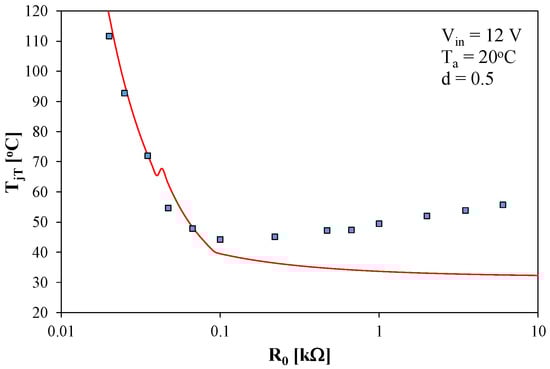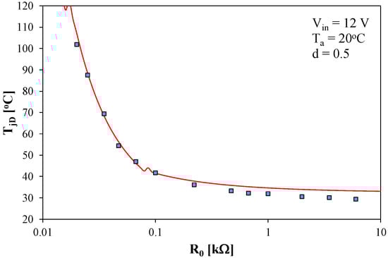 As can be seen, very good accuracy in modeling this dependence was obtained only was CCM. In DCM differences between the results of measurements and computations increased with an increase in load resistance. They exceeded even 20 °C at R0 > 6 kΩ which could be connected with a long switching-off process of IGBT [], that was not taken into account in the proposed model.