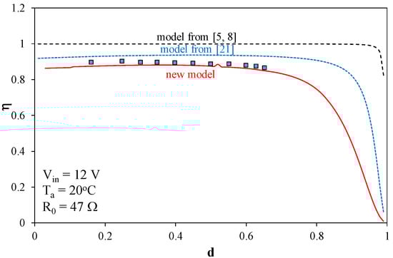As can be observed, dependences η(d) were monotonically decreasing functions. The results of computations performed with the electrothermal model were convergent with the result of measurements. Differences do not exceed 2%. Values of watt-hour efficiency computed using the other models were overstated even by 15%.
