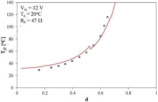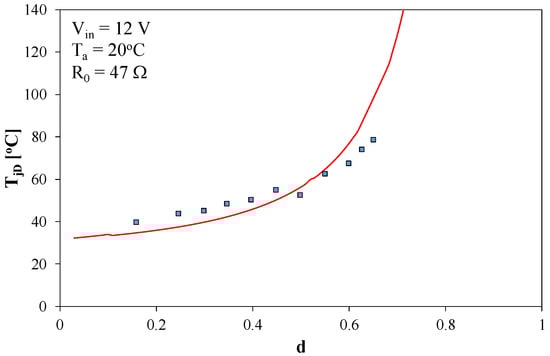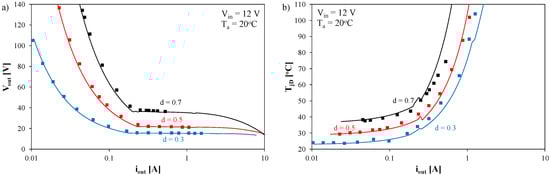 As it can be observed in Figure 16a, very good agreement between computed and measured output characteristics of the tested converter was obtained at all the considered values of duty cycle. The considered dependence was a decreasing function. The critical output current at which the mode of DC–DC converter operation change from DCM to CCM decreased with an increase in duty cycle d. In turn, in Figure 16b, it can be observed that the dependence TjD(iout) was an increasing function and values of temperature TjD increase with an increase in duty cycle.