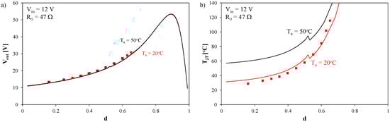 It is clearly visible in Figure 17a that changes in value of ambient temperature practically do not influence value of output voltage of the tested boost converter. Points marking results of measurements performed in both the values of ambient temperature practically overlap as well as lines representing computations performed for these values of Ta. Changes in value of Vout voltage caused by change in ambient temperature did not exceed 0.3 V. Hence, small value of these changes was a result of weak influence of temperature on IGBT output voltage. The same result were obtained during computations and measurements. In contrast, in Figure 17b, it is visible that change in the value of ambient temperature caused practically the same change in the value of internal temperature of the diode. The same influence of ambient temperature the Authors observed also for internal temperature of IGBT.