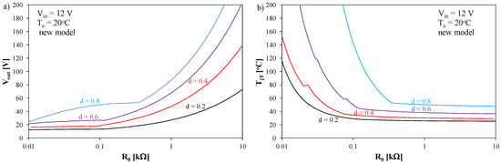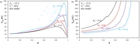 Some additional computations of the tested boost converter were performed using the worked-out electrothermal averaged model of a diode transistor switch, including the IGBT and a rapid switching diode. For example, Figure 18 illustrated influence of load resistance on dependences of converter output voltage (Figure 18a) and internal temperature of the diode (Figure 18b) on the duty cycle.