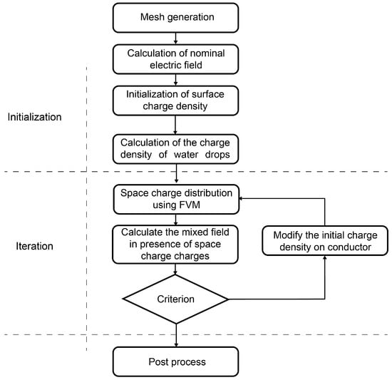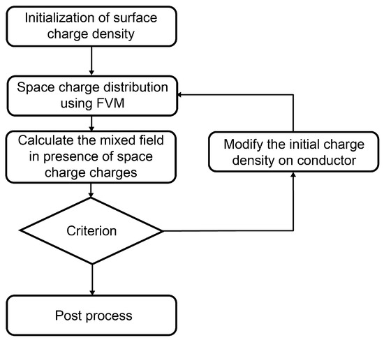 The solution of the electric field is composed of the nominal field and the field generated by the space charges derive from ions and water drops in the calculation domain. Normally, the analytical method possesses higher precision in contrast to the numerical method, such as FVM and the finite difference method (FDM). In this method, CSM is utilized to solve the nominal field []. Simulation charges placed in the conductor interior are solved by: