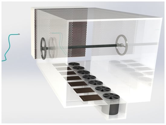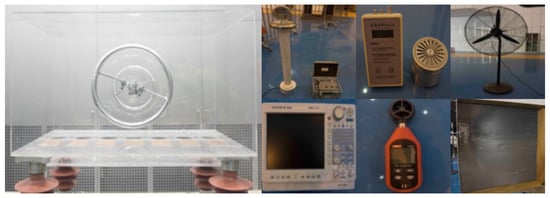 The stranded conductor goes across the tunnel transversely and is hung at the center points of two opposite sides. The radius of the conductor is 10 mm in this experiment. Regarding the measurement of electric field and ion flow current, seven field mills and seven 100 × 80 mm Wilson plates are flush-mounted beneath the conductor in parallel. Signals of the Wilson plates were collected by scope corder DL-850. The voltage supply is an adjustable DC voltage generator. Wind flow of 0–10 m/s was provided by a fan and passed through a flow equalizing plate to reduce fluctuation. The wind velocity was measured by a high precision digital anemometer (AS-8336). A spray pump was used to generate water drops, and two nozzles with different diameters were adopted to control the MVD of water drops. All of these are illustrated in Figure 6.