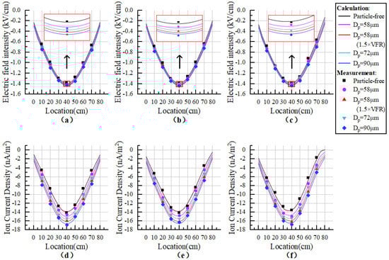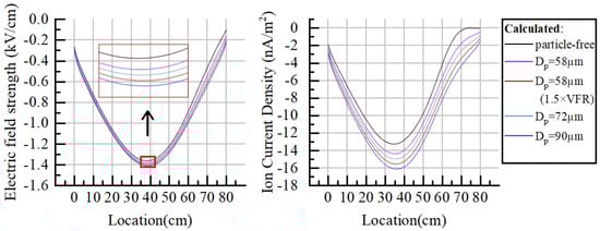 The relevant calculated and experimental results are demonstrated in Figure 7. The results reveal that the electric field is influenced by the charged water drops together with the wind flow velocity to a slight extent. However, shifts of the curves remain visible owing to the increment of the charge quantity of water drops and the wind flow velocity. It proves that the electric field is primarily dominated by the energized electrode rather than the space charge density.