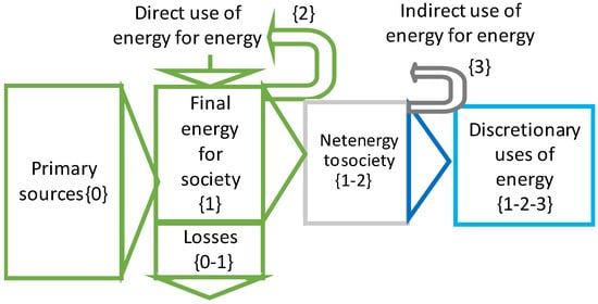 Energy flux from primary material sources of energy {0} to discretionary uses of energy. EROIst = ({0}/g)/{2} (EROI standard, being “g“ a correction factor to convert “primary” to final). EROIfinal = {1}/{2′} (EROI final, where {2′} includes the direct use of energy to bring it to the user) and EROIext = {1}/({2’+3}) (EROI extended, all the terms at final and user phase). Note that the relevant energy for a society is the blue box (discretionary uses of energy), but primary sources of energy, and the other boxes, are relevant for environment issues because they are always taken/used in the biosphere (see reference [] for more details).