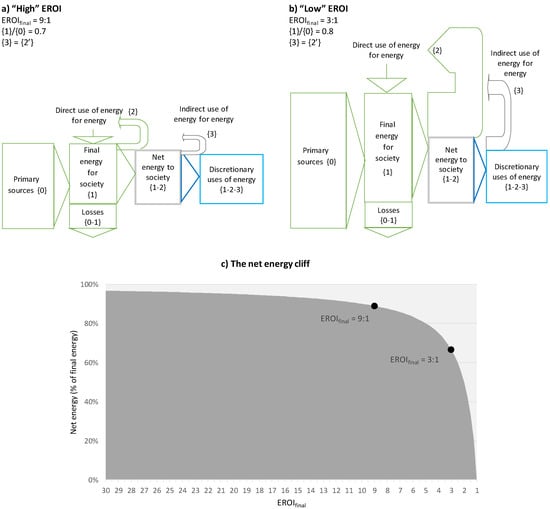 A comparison between two hypothetical societies with the same energy flow available for discretionary uses {1-2′-3} (blue box) but with different EROIfinal and relative losses ({0-1}/{1}). The size of vertical arrows is at scale. (a) EROIfinal = 9:1, {1}/{0} = 0.7, assuming indirect energy use equal to direct one (see Section 3); (b) EROIfinal= 3:1, {1}/{0} = 0.8, indirect energy used equal to direct one ({2′} = {3}); (c) shows the resulting share of net power vs. gross power in the net energy cliff.