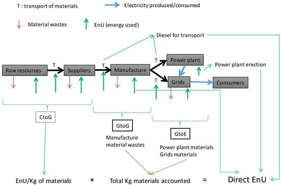 To estimate the direct energy used by the energy system to deliver energy (EnUdirect) we use data of energy intensities (MJ/kg) at the Cradle to Gate phase (including transport) from the materials used in the power plants and the operation and maintenance (O&M) of the grids and the losses of the manufacture phase for the material used in power plants. We add to this account the energy used in the power plant erection, the energy used in the manufacture phase and the diesel energy for transport in supplier gate to manufacture gate (GtoG) and manufacture gate to erection of the power plant (GtoE).
