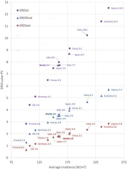 EROI levels at standard (EROIst), final (EROIfinal), and extended (EROIext) stages of PV solar on land for the top 10 countries with more installed capacity, the global average, and Finland and Cyprus as holders of the minimum and maximum irradiance at European Union (EU) level. The current weighted global average for solar irradiance where power plants are installed is found to be ~160 W/m2.