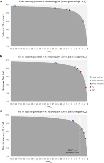 It has also to be highlighted that a minimum EROI to maintain a sustainable modern complex society cannot be established, precisely given that the reduced availability of discretionary energy as intermediary operations become less efficient is a gradual non-linear process with increasing and cascade consequences over time. Hence, it can also be useful to think about ranges and increasing levels of risk (see, e.g., discussions in Brandt [] and around Figure 9 in []). This minimum EROI depend also ultimately on social decisions, depending on how each society decides to allocate the available resources in case of decreasing EROI between investments and consumption taking into account also social inequalities. See the Discussion section in this paper for our views on how to approach this issue in further research.