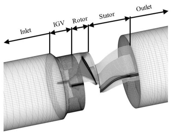 The grid system was composed of tetrahedral meshes in the IGV domain and hexahedral meshes in the impeller, diffuser, suction, and discharge columns domains. The normalized distance of the first grid from the wall (y+) was maintained to be <2 to apply the low Reynolds number SST model. To find the optimal number of the grid system, a grid dependency test was carried out with the number of grids in a range of 1,500,000–12,000,000 in a previous study []. As the result, the optimal number of meshes for the computation were determined to be approximately 3,800,000.