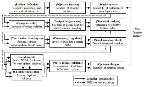 The multi-objective optimization was carried out in two stages for the impeller and the diffuser vanes, through the hybrid MOEA coupled with the RSA surrogate model. The aim of the first stage of the multi-objective optimization was to simultaneously improve the objective functions with the two design variables related to the swept angle and the pitch angle of the impeller blades. Then, the second stage of the multi-objective optimization based on the first optimization results was performed by the same method. The overall optimization procedures adopted in this work are described in the flow chart presented in Figure 3. First, design variables and objective functions were selected, and the ranges of the design variables were set up based on a parametric study.