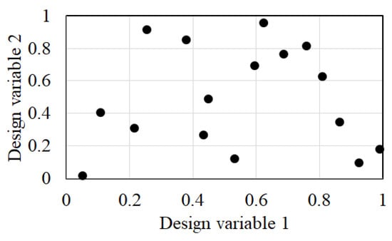 Latin hypercube sampling (LHS) [] was used to select design (sampling) points in the design space as a DOE technique. LHS uses an m × N matrix where m and N are the number of levels of examination and the number of design variables, respectively. Each N column of the matrix containing m level rows is randomly paired to form a Latin hypercube. Accordingly, LHS generates a group of random sample points and ensures that it effectively fills the entire design space. Figure 4 shows the design points selected by the LHS for two design variables. In the present study, these design points were used as sampling points in space for the design variables of the swept impeller and the diffuser vanes.