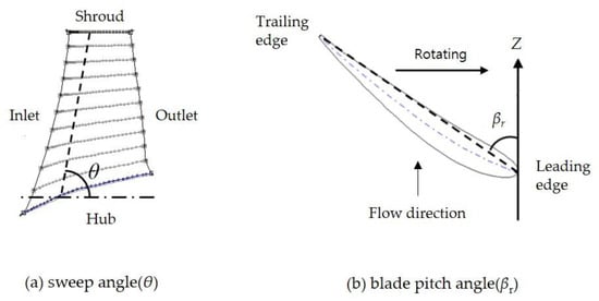 Figure 5 presents the definition of the sweep (θ) and pitch (βr) angles of the swept impeller. Changes in the angles (θc and βc) from the θ and βr of the reference shape were selected as two design variables based on the results of the previous study [] which investigated the effects of the geometric parameters on the hydrodynamic performances of the submersible pump. Figure 5a shows the meridional plane of the swept impeller, and θ indicates the angle of inclination in the chord direction between the rotating axis and the line connecting the 25% chord of hub and the shroud of the blade.