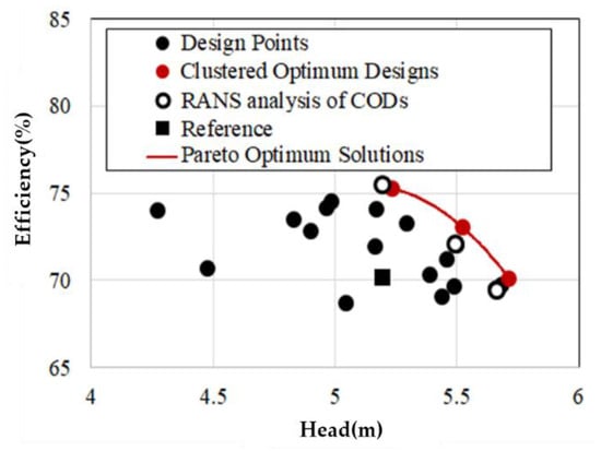 Figure 6 shows the global POSs, the reference design, the sixteen design points and the three representative clustered optimum designs (CODs). As objective function values for the total efficiency and the head are to be simultaneously maximized, a trade-off correlation was obviously shown between those values. A higher total efficiency was observed at a lower total head, and vice versa.