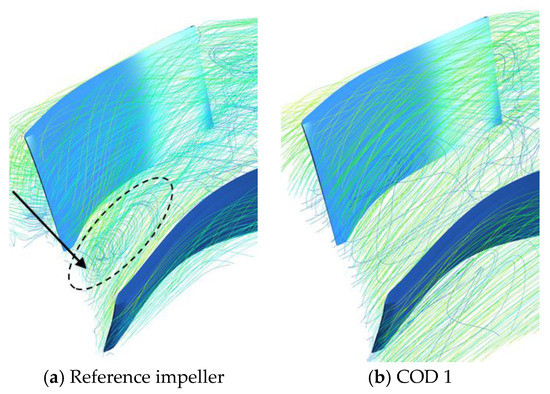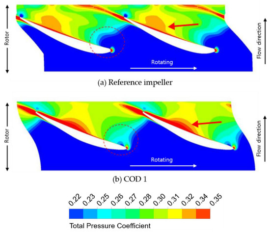 where P is total pressure and Pin is total pressure averaged at the inlet of the computational domain, and V is the tip speed of the rotating impeller. In the reference design, the low total pressure region (red dashed circle) is widely distributed near the leading edge of the impeller. This total pressure distribution near the leading edge is improved in COD 1. The low total pressure in this region is improved as a consequence of the optimization and the improved total pressure presents the reason for the increased efficiency without having loss of the total head. In addition, it is observed that the total pressure distributions (red allow) near the pressure side of the swept impeller are also improved in COD 1.